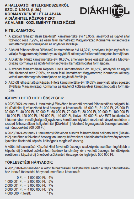 A Diákhitel Központ Zrt. nyilvános adatbázisokat nem tart fenn, a hitelfelvevők hallgatói hitelszerződésekkel összefüggésben kezelt személyes adatai vonatkozásában a kezelt adatok körét, az adatkezelések célját, időtartamát, módját, az adatok forrását, az adattovábbításokat, adatfeldolgozásokat és az érintettek jogait az egyes hiteltermékek Üzletszabályzatának mellékletét képező Adatkezelési Tájékoztató tartalmazza. Az egyes hiteltermékek Üzletszabályzatai és Adatkezelési Tájékoztatói letölthető formában a https://dhwcag.staging.introweb.hu/uzletszabalyzat honlapon érhetők el.